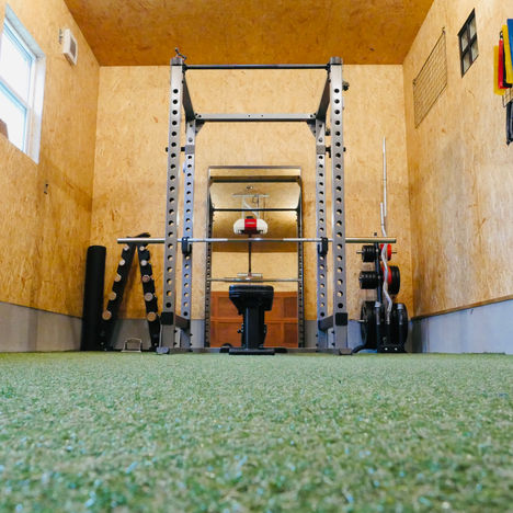 アイサジム1号店。木のぬくもりに包まれたガレージ内は天井が高く、圧迫感が一切ない貴重なプライベート空間。更に間接照明が集中力を高めトレーニング効率もアップ。理想の身体へと導きます。